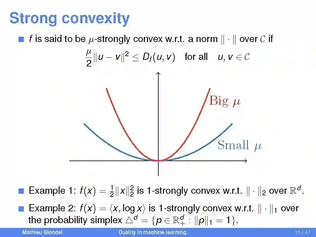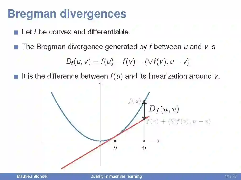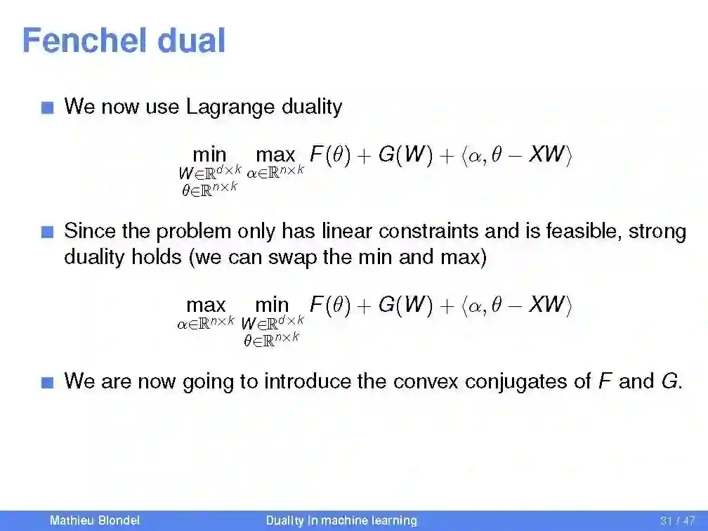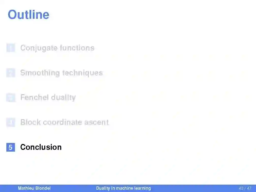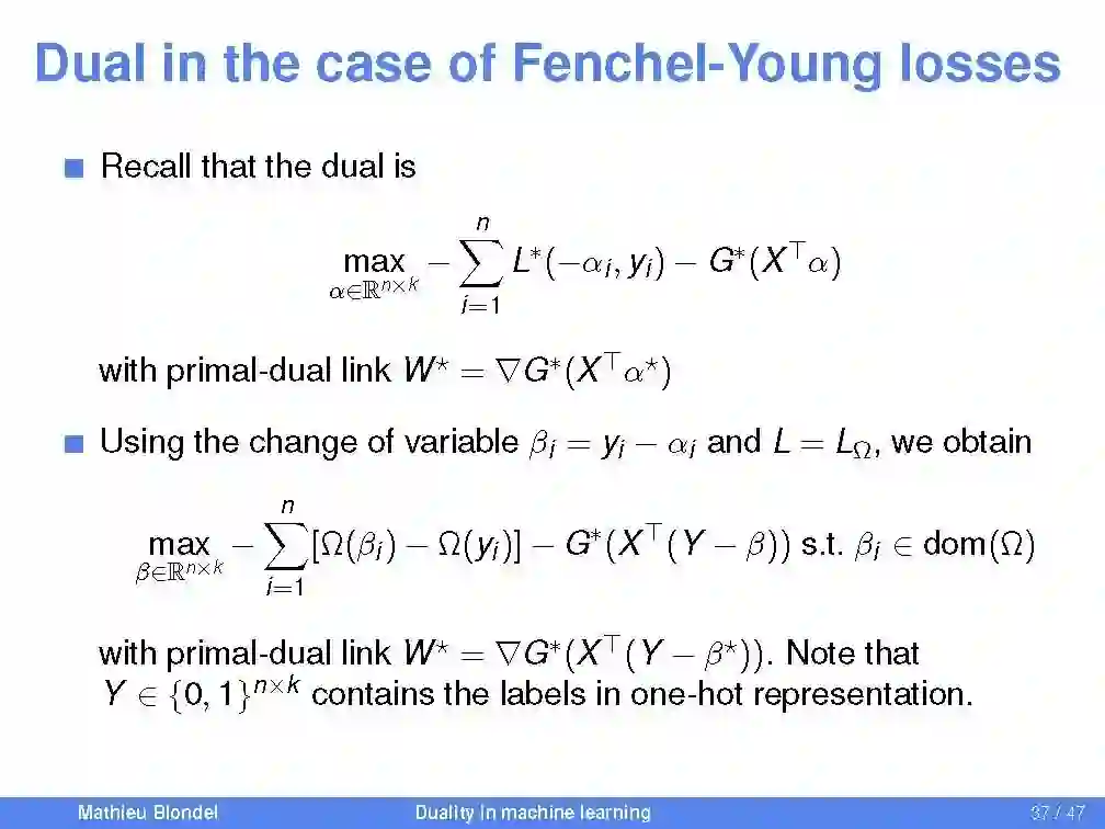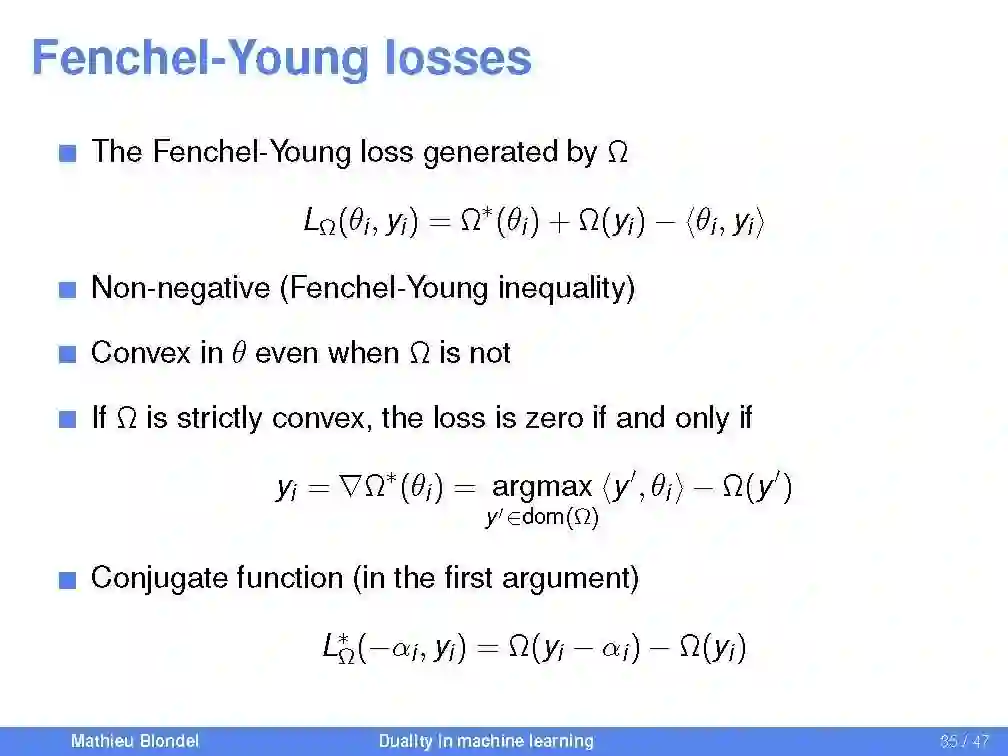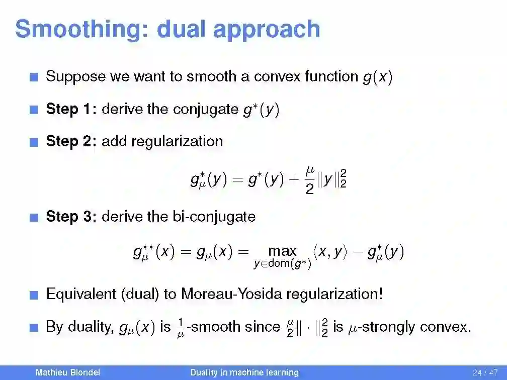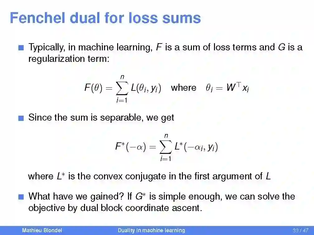 Google 研究科学家Mathieu Blondel在PSL大学的“机器学习的对偶性”课程材料。主题包括共轭函数,平滑技术,Fenchel对偶性,Fenchel-Young损失和块对偶坐标上升算法。