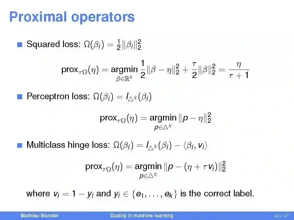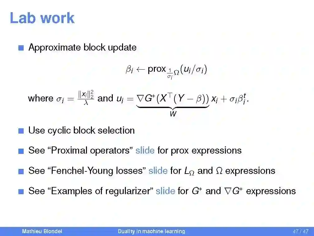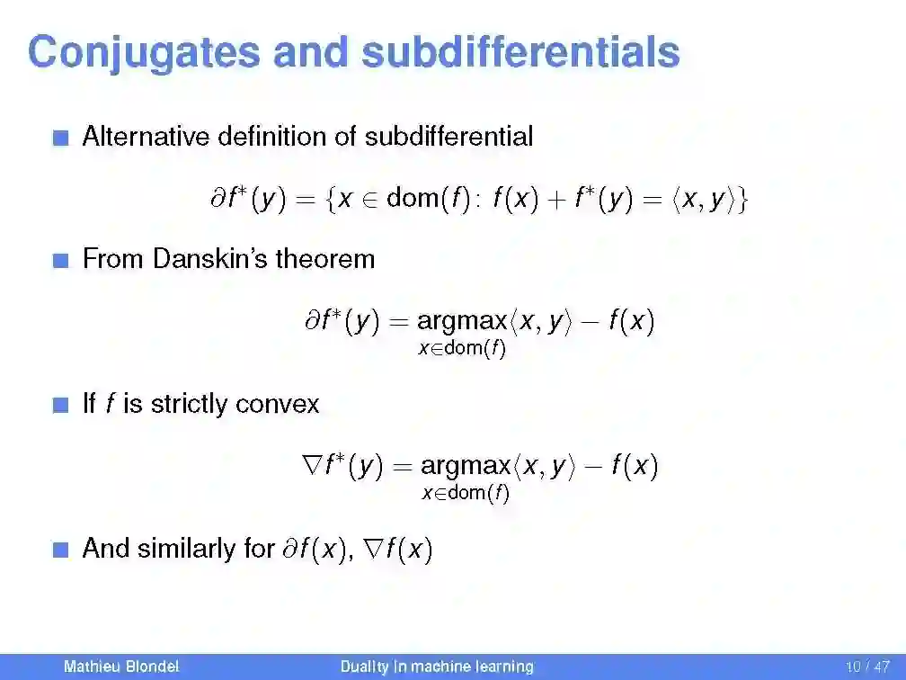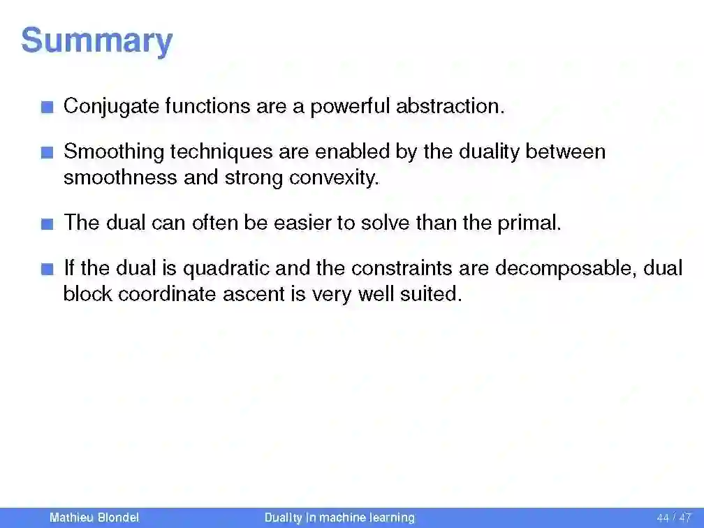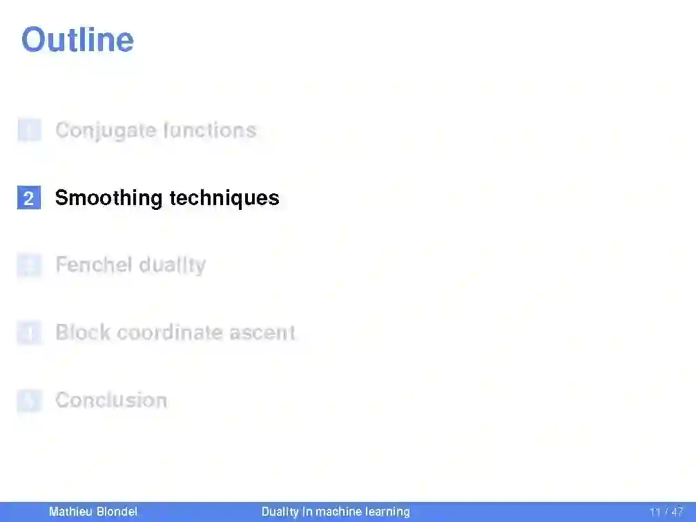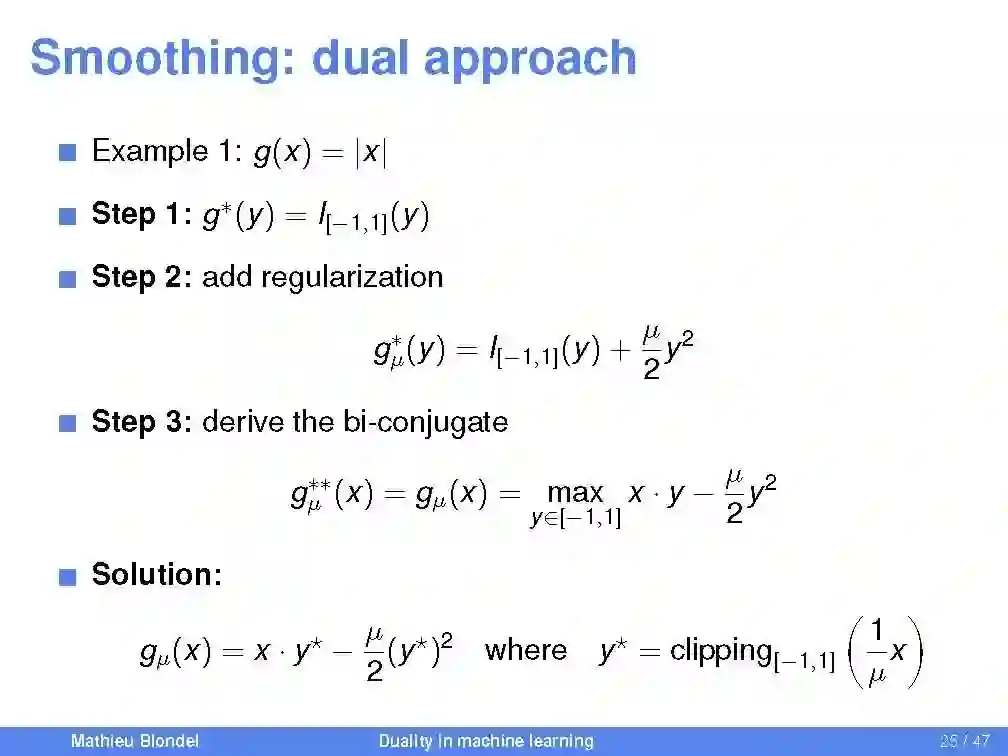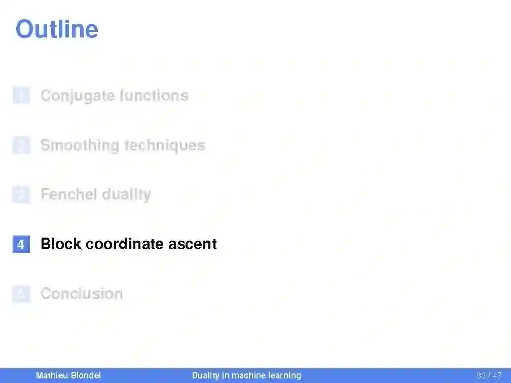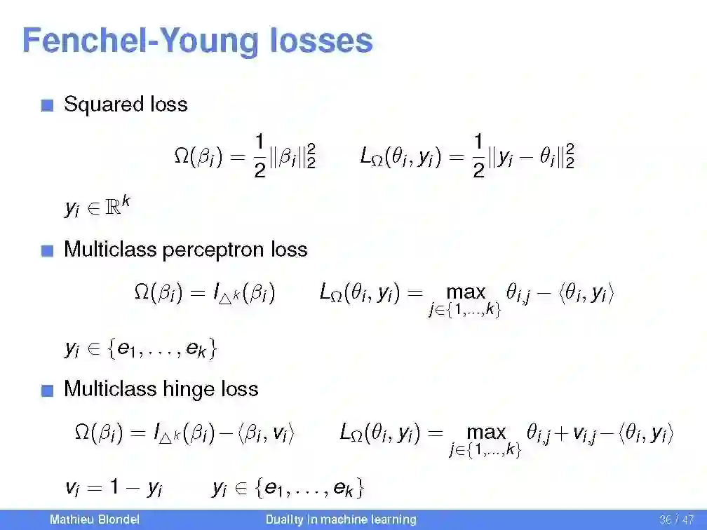Google 研究科学家Mathieu Blondel在PSL大学的“机器学习的对偶性”课程材料。主题包括共轭函数,平滑技术,Fenchel对偶性,Fenchel-Young损失和块对偶坐标上升算法。