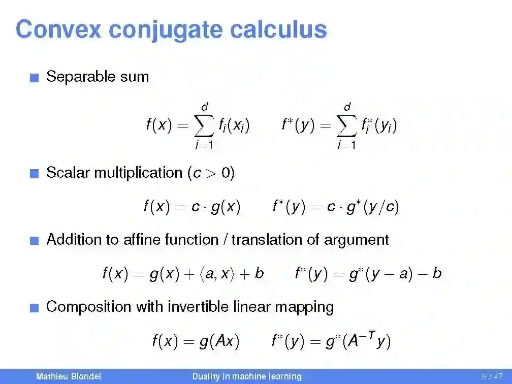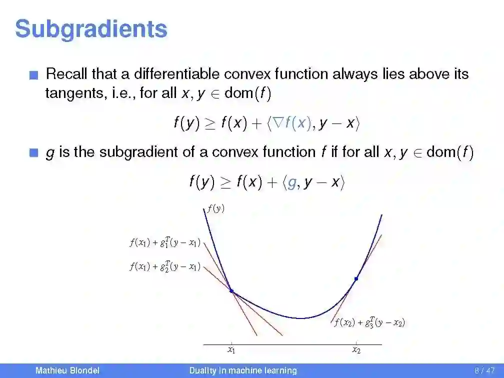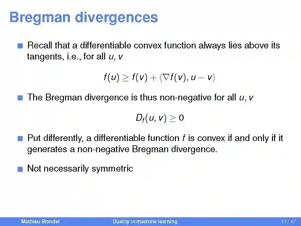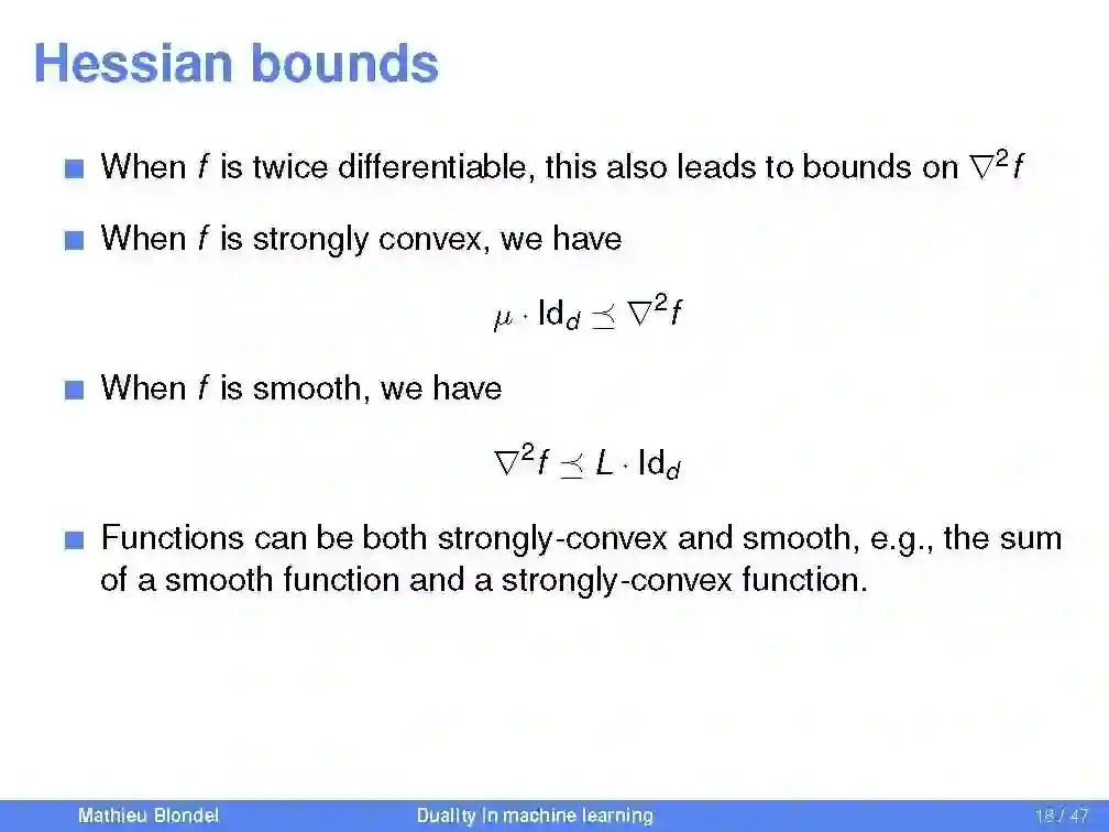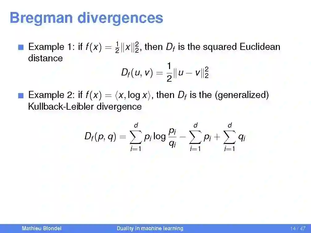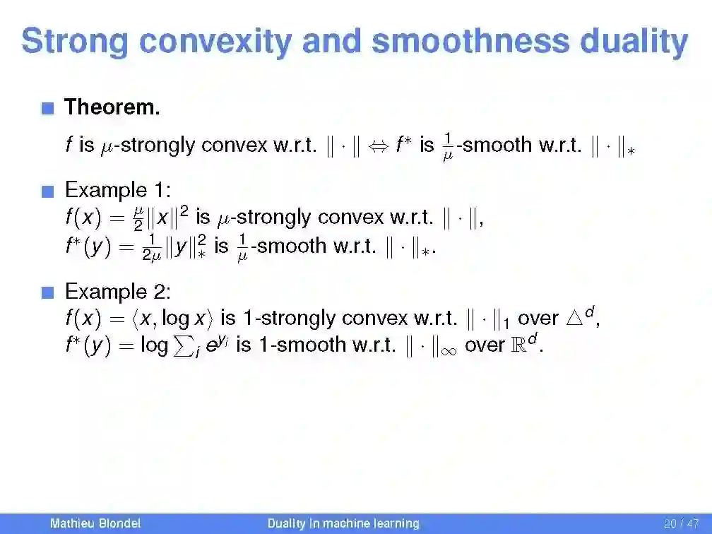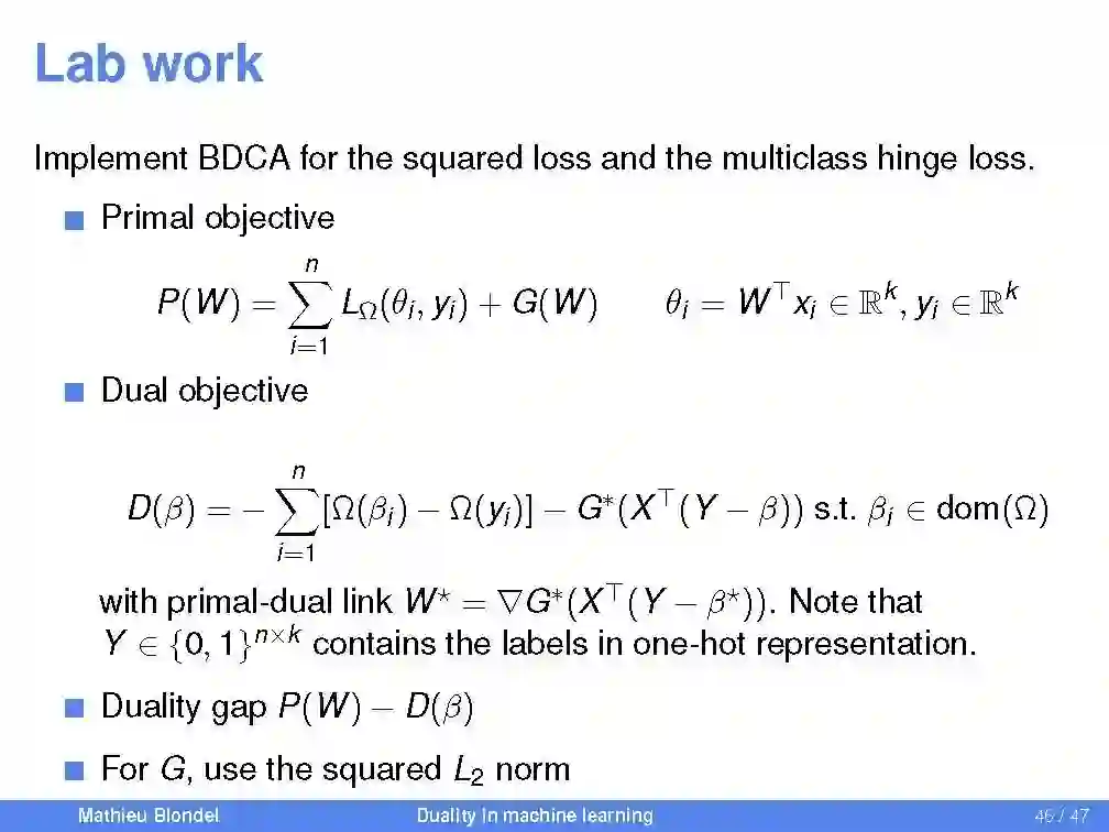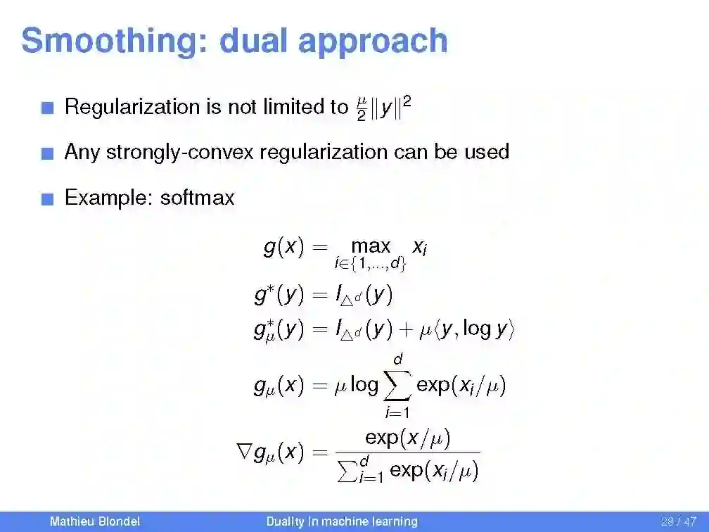 Google 研究科学家Mathieu Blondel在PSL大学的“机器学习的对偶性”课程材料。主题包括共轭函数,平滑技术,Fenchel对偶性,Fenchel-Young损失和块对偶坐标上升算法。