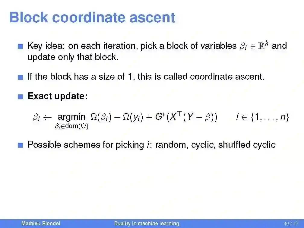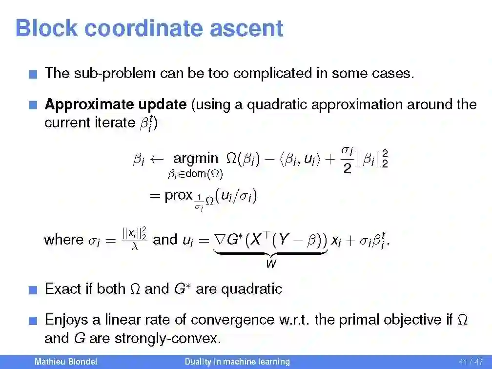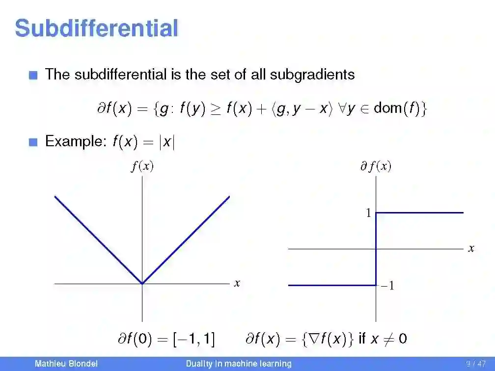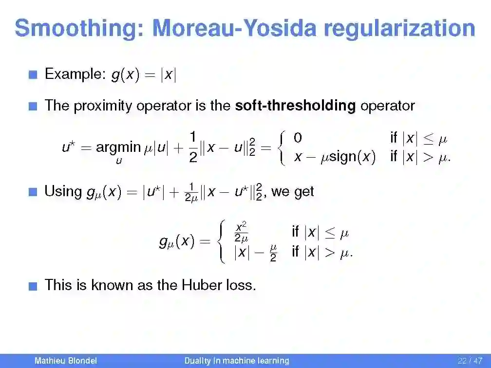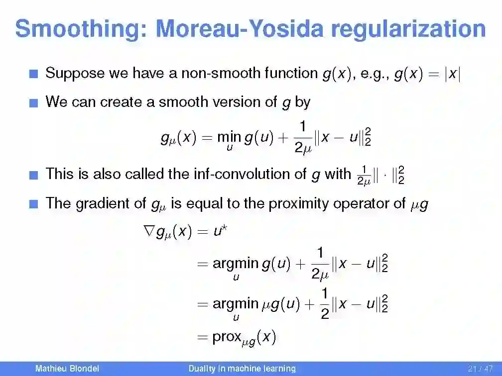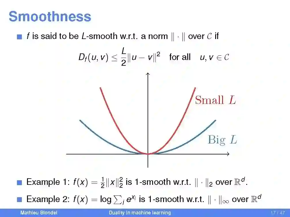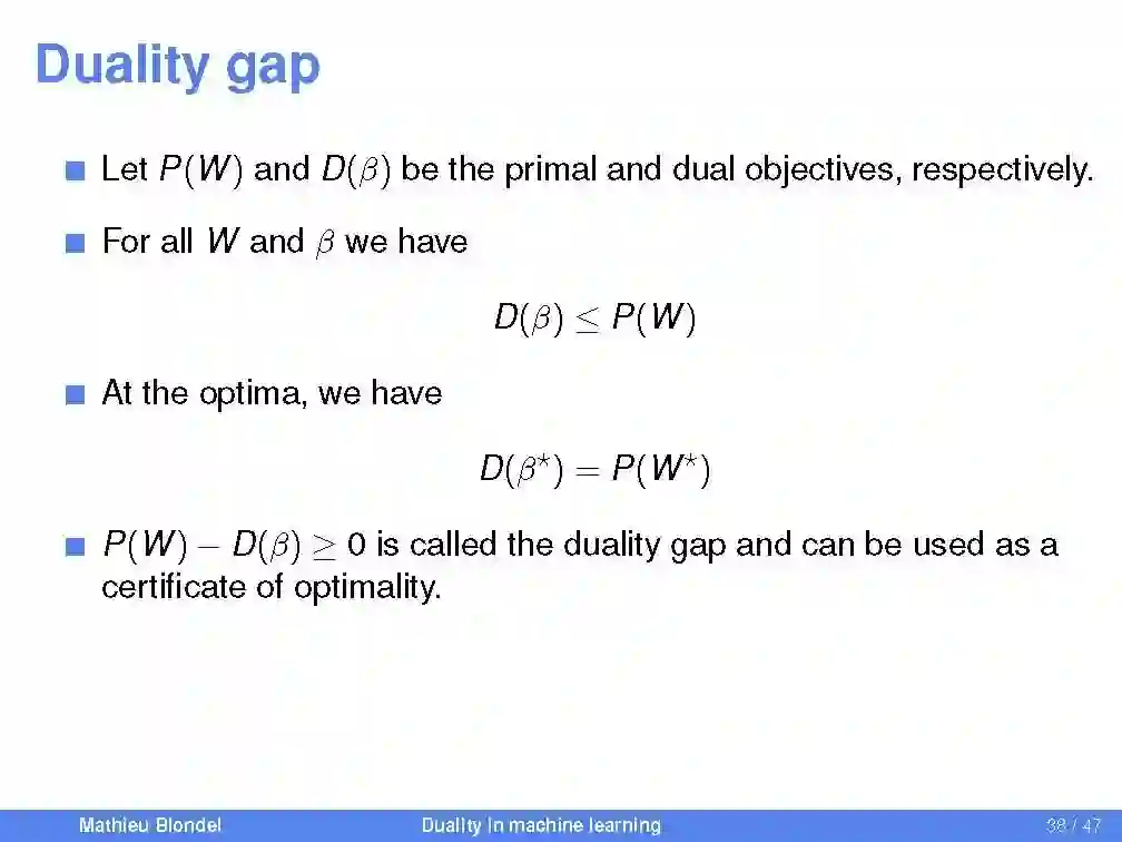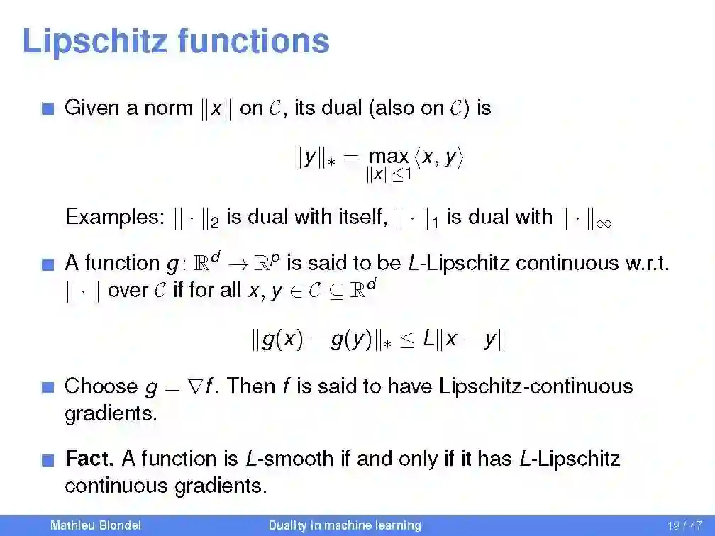 Google 研究科学家Mathieu Blondel在PSL大学的“机器学习的对偶性”课程材料。主题包括共轭函数,平滑技术,Fenchel对偶性,Fenchel-Young损失和块对偶坐标上升算法。