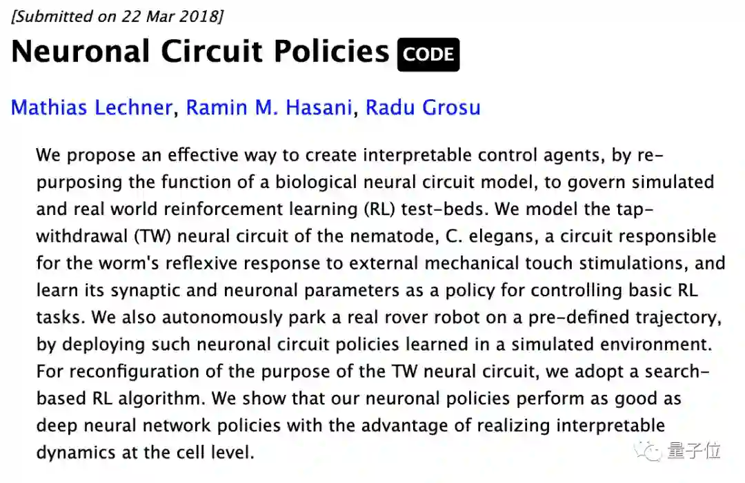 他们从秀丽隐杆线虫这种生物受到启发,在2018年提出了一种神经元回路策略(Neuronal Circuit Policies,NCP)。