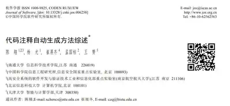 随着软件项目的复杂度和软件产品迭代频率的不断提升,程序理解在整个软件开发环节的重要性也日益 提高.最近的一项研究工作[1]表明:开发人员平均需要花费 59%的时间在程序理解上.无疑高质量的代码注释是 提高开发人员程序理解效率的关键[2].但开发人员由于项目开发预算有限、编程经验不足或者对代码注释的重 视程度不够,经常会造成代码注释的缺失、不足或者与代码实际内容不匹配等问题.虽然借助一些工具(例如 JavaDoc[3]和 Doxygen)可以辅助生成代码注释模板,但仍然不能自动生成与代码实现功能和目的相关的描述. 如果由开发人员手工输入代码注释则费时费力,并且注释的质量很难得到保障.除此之外,已有的代码注释也需 要随着相关代码的持续演化而保持同步更新[4].因此亟需研究人员设计出有效的代码注释自动生成(code comment generation)方法.