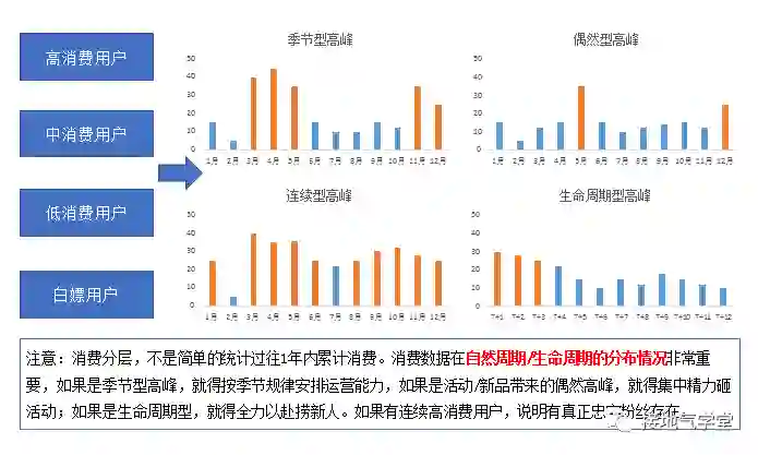 注意:识别高消费,不是简单地统计一下过去一年消费金额;而是要用生命周期的观察方法,观察用户从注册开始的消费分布。