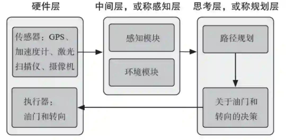 架构最左侧的部分是硬件层,其中包括传感器和执行器,前者负责收集数据,后者控制转向、刹车和发动机转速。