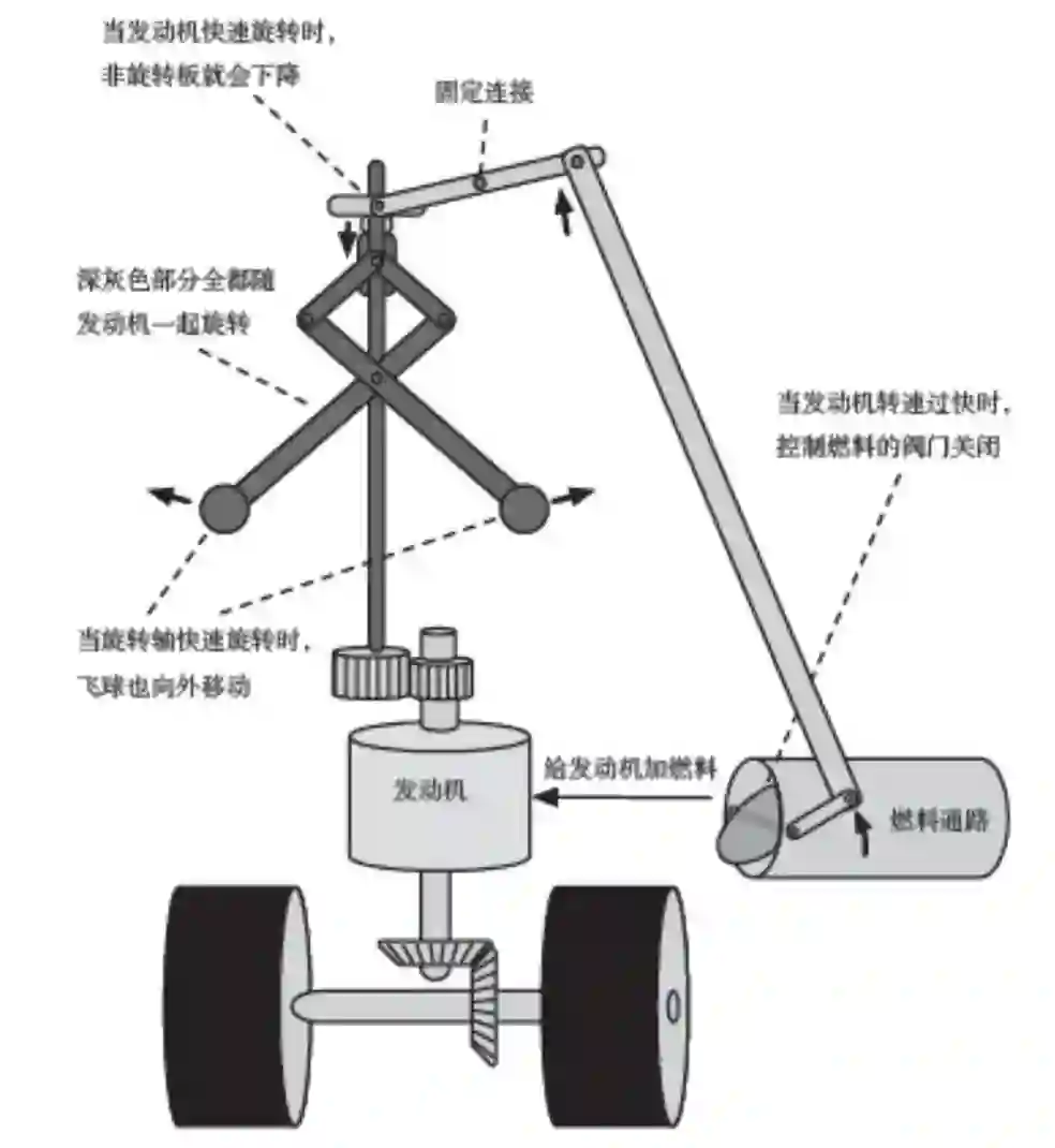 答案是,沃康松那个时代的人通过使用一种叫离心调速器的装置,创建了一个反馈回路来控制发动机的速度。离心调速器是一种带有两个金属飞球的“旋转”装置,如下图所示: