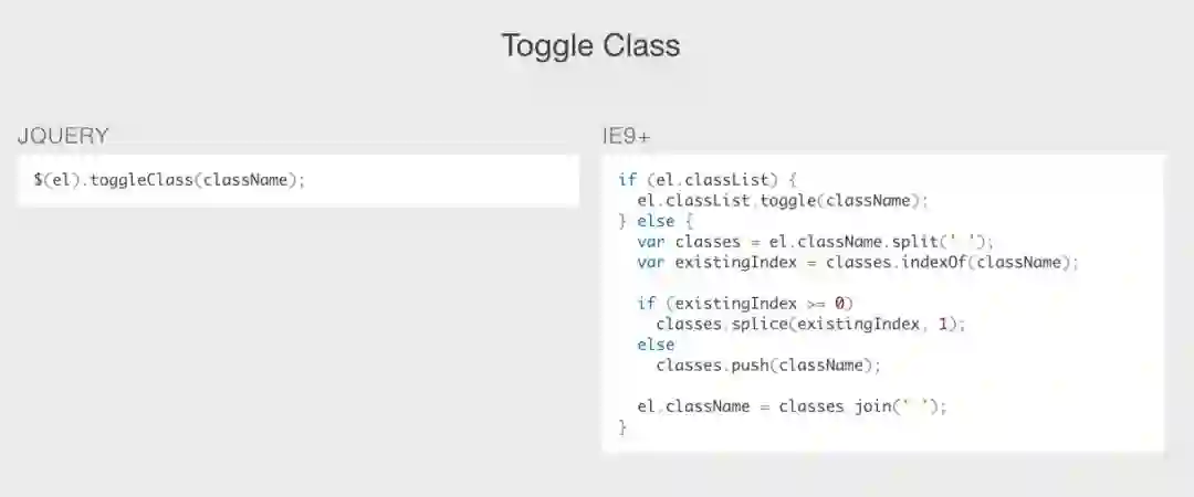 下图是 jQuery 与原生 JavaScript(又称为 vanilla js)的比较,站在巨人的肩膀上以后,可以少写很多行程序代码。