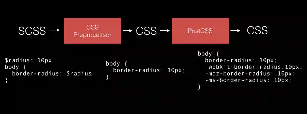 在这边你要知道 PostCSS 跟 CSS preprocessor 的差别在哪,前者的 input 是 CSS,output 是加上了 prefix 之后的 CSS;后者的 input 是 SCSS(或其他),output 是 CSS。你甚至可以把两者合在一起用: