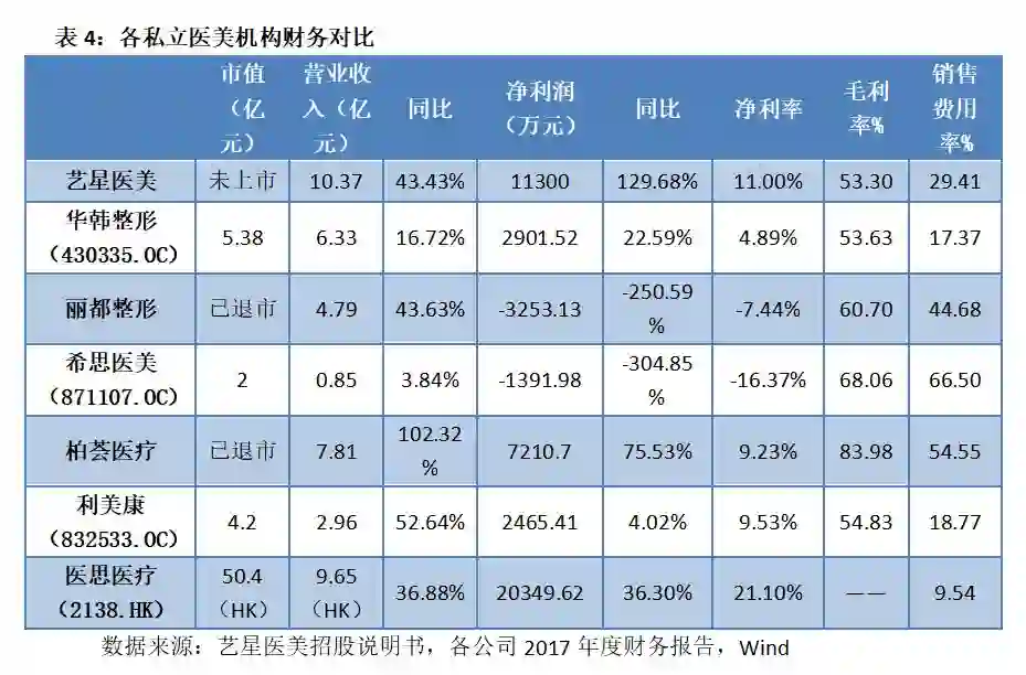 在整个医美行业中,私立医美机构占据了80%以上的市场份额,一些靠前的机构已逐渐拥有自己的市场地位。1999年成立的美莱医疗,拥有美莱整形和华美整形两个品牌,并已走出国门,在韩国和日本都有分店,覆盖亚洲28个城市,从知名度和经营规模来看较为靠前。而华韩、丽都、希思、柏荟等医美机构也已经在新三板挂牌,但尚不存在占有市场总份额超过5%的单一服务机构,私立医美行业依旧相当分散(表4)。