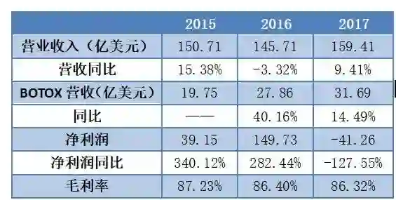 以肉毒素为例,目前通过国家食药监局正式批文的A型肉毒素的只有两家,一家是美国艾尔建医疗(Allergan,AGN.NYSE)生产的A型肉毒素BOTOX,每100单位的价格范围在6000-8000元,一家是兰州衡力生产的注射用A型肉毒素,每100单位价格在2000-3000元之间。根据美国艾尔建医疗的年报,其肉毒素产品的毛利率高达60-80%,公司综合毛利率都在80%以上,公司2016、2017年业绩出现下滑甚至大幅亏损的原因是有两个产品的专利期过期,独家专利经营权失效,但肉毒素BOTOX的销售依旧保持稳定,2017年实现销售收入31.69亿美元,同比增长14.49%,是艾尔建公司销售额最大的产品(表7)。