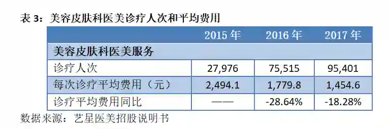 皮肤医美则包括祛斑、美白、嫩肤、脱毛等等,项目较多且定价不一,每次诊疗的平均费用为1454.6元,2017年取得收入1.39亿元(表3)。