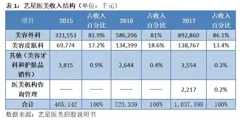 艺星医美的收入来源于三个部分:美容外科、美容皮肤科以及美容牙科和护肤品销售(表1)。其中美容外科在2017年贡献了86.1%的营收,美容皮肤科占到13.4%,其他的业务规模相对较小。