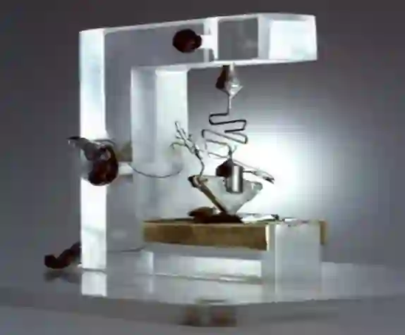 点接触式晶体管:把间距为50 μm的两个金电极压在锗半导体上,微小的电信号由一个金电极 (发射极) 进入锗半导体 (基极) 并被显著放大,然后通过另一个金电极 (集电极) 输出,这个器件在1kHz的增益为4.5。来源:贝尔实验室