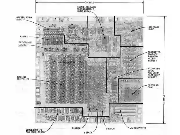 TMC0281于1978年发布,使用被称为线性预测编码(linear predictive coding,LPC)的技术产生语音,所产生的声音是一些嗡嗡声、嘶嘶声和爆裂声的组合。对于“产生语音”这件被认为是“不可能在集成电路中实现的”的事情,这是一个令人惊讶的解决方案。