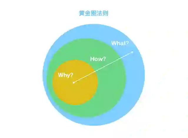 黄金圈法则:一种以目标为中心的思维方式,它把思考和认识问题画成三个圈:最外面的圈层是 What 层,也就是做什么,指的是事情的表象;中间的圈层是 How 层面,也就是怎么做,是实现目标的途径;最里边的圈层是 Why 层面,就是为什么做。