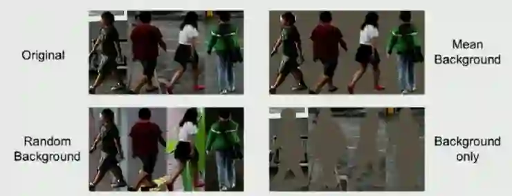与 query 图片有相似背景但不同行人的图片排在 rank 6,而同一行人不同背景的图片却排在 rank 25。那么在行人重识别中,背景到底会带来多大的偏差呢?李鸿升等人通过在 CUHK03 和 Market-1501 数据集上使用 human parsing mask 的方法获得了 3 类数据集:mean background、random background 和 background only,如下图所示: