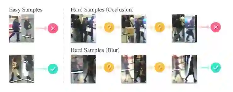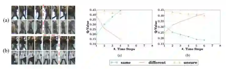 如上图所示,左侧两张图片可以很容易检测出是否是同一个人,因此期望设计出的模型只是用一对图片做判别即可;而另一方面,右侧的图片,由于遮挡、模糊的原因,一对图片很难判断是否是同一个人,因此希望模型能够自动地选择适量的图片对进行行人身份判断。
