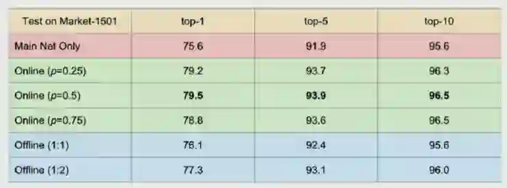 首先他们通过 huaman parsing 方法获得 4 类人体 parsing map(整体、头、躯干、腿),然后用这些 parsing map 从不同的人体区域做特征池化。他们分别对有无背景以及不同比例、on-off line 做了实验对比: