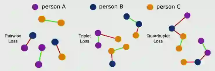 现有方法在通过深度神经网络学习视觉相似性时,一个局限性问题是在其 loss 函数中只用了局部约束。例如下图所示的 pairwise loss、triplet loss 或者 quardruplet loss: