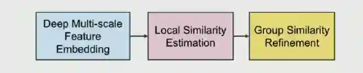 共分为三步:先进性深度多尺度 feature embedding(使用了 ResNet-50 作为主体网络),然后对图片进行一个局部的相似性估计(得到两张图片 I_m,I_n 的局部预估计相似性为 t_mn),最后一步为组相似性增强。