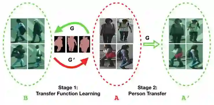 这个 GAN 网络的目标就是将一个数据集 A 上的风格(包括背景、光照、照相机参数等)转化为另一个数据集 B 的风格,转换完之后则可以使用数据集 A' 作为数据集 B 的训练集。这里要保证两个方面:第一,变换后的风格符合数据集 B 的风格;第二,要保证变换前后人的身份信息不变。