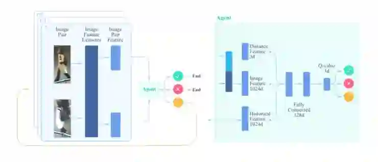 (1)Actions。图片对生成的 feature 送入 agent 后,agent 将作出三种判断:same,different 和 unsure。当判断结果为 unsure 时,就会返回到开头重新进行判断。