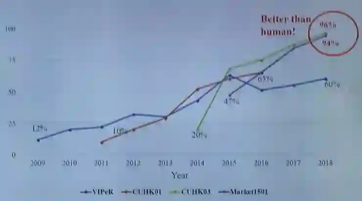 从 2005 年行人重识别任务首次提出后,经过 2014 年深度学习被引入该领域,行人重识别的研究得到大量的研究(例如 CVPR 上行人重识别的文章从 2014 年的 3 篇剧增到今年的 32 篇),在这些研究中各种模型所表现出的性能也逐步提升,在今年的一些数据集(例如 CUHK03、Market501)上一些方法的表现甚至超越了人类。