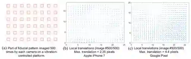 图3:(b)和(c)展示了Apple iPhone 7和Google Pixel的对齐平移量。