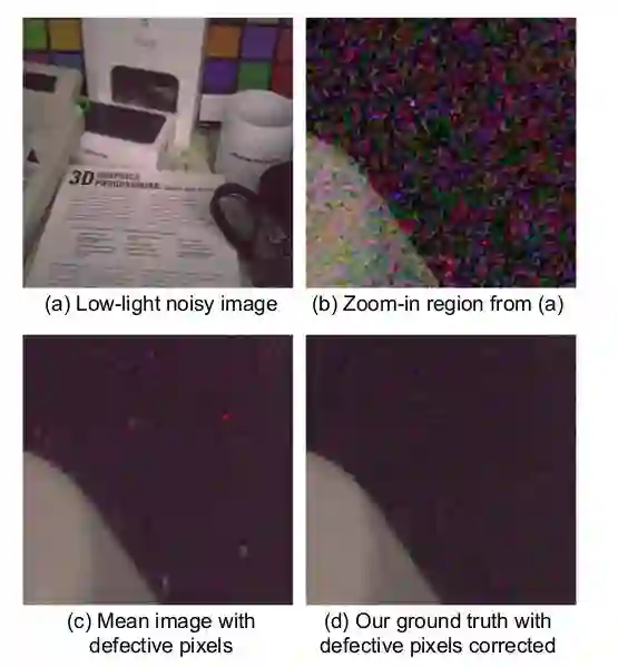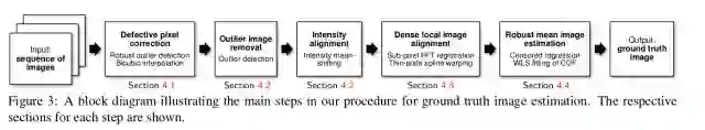 图1:图一展示了SIDD建立的全过程。首先需要采集数据,然后去除错误像素和错误影像,接写来对影像进行对齐,最后生成“无噪声”的真实影像。