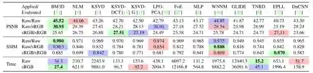 2)分析和验证了本文数据集的可靠性,测试了一些目前常用的降噪算法在本文数据集山上的表现,同时发现使用SIDD训练的CNN降噪模型效果更好。