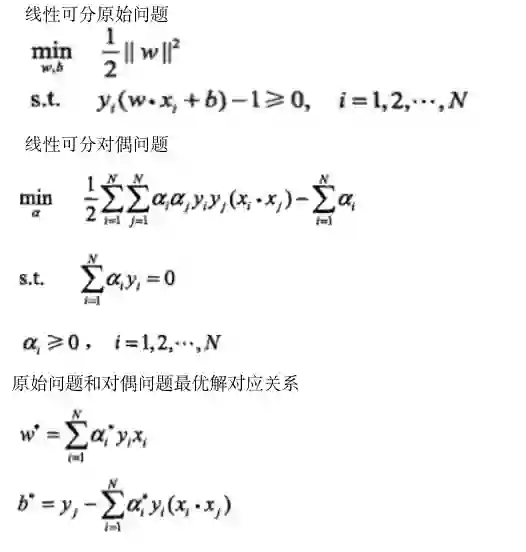为了更容易地求解支持向量的优化问题,和自然地引入核函数,应用拉格朗日对偶性将原始问题转化为对偶问题进行求解,线性可分svm原始问题与对偶问题对应关系如下: