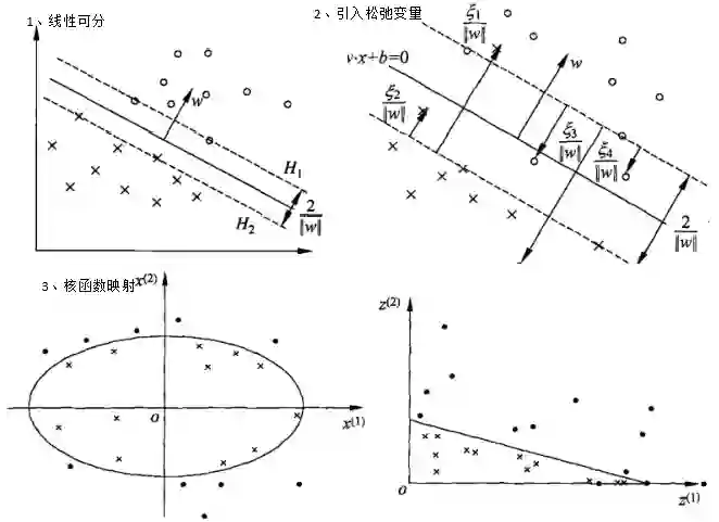 支持向量机(svm)通过寻找一个超平面来对样本进行分割,分割的原则是间隔最大化,最终转化为一个凸二次规划问题来求解。通常有三种情况: