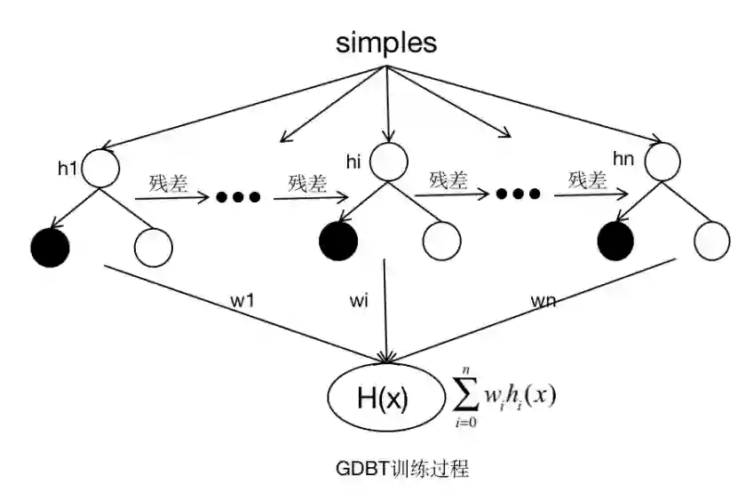 梯度提升决策树(GDBT)采用加法模型,不断减小训练过程产生的残差来达到将数据分类或者回归的算法。GBDT通过多轮迭代,每轮迭代产生一个弱分类器,弱分类器一般为CART TREE(分类回归树),每个分类器在上一轮分类器的残差基础上进行训练。最终的总分类器 是将每轮训练得到的弱分类器加权求和得到的。模型最终可以描述为: