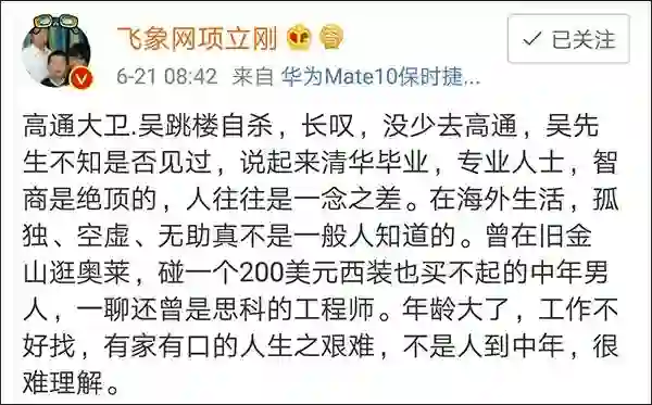 国内IT及通讯行业观察人士@飞象网项立刚 及其他网友对这位华裔中年IT男的自杀颇为唏嘘,他们感叹“IT行业中年失业确实很难办”: