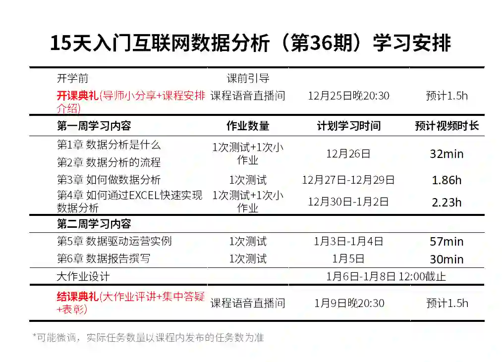 完整的课程学习由视频学习+章节小作业/测试+大作业+提问/答疑组成学习安排可以参考下方课程表: