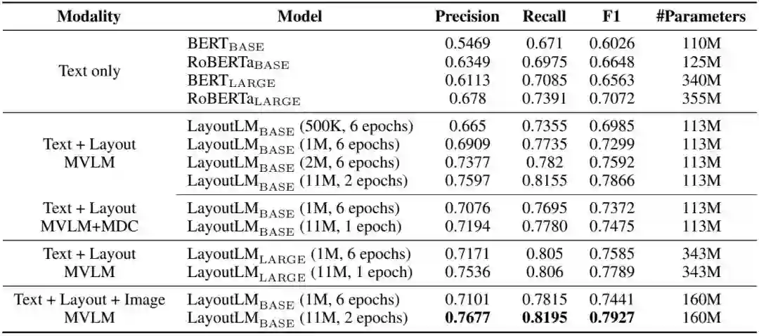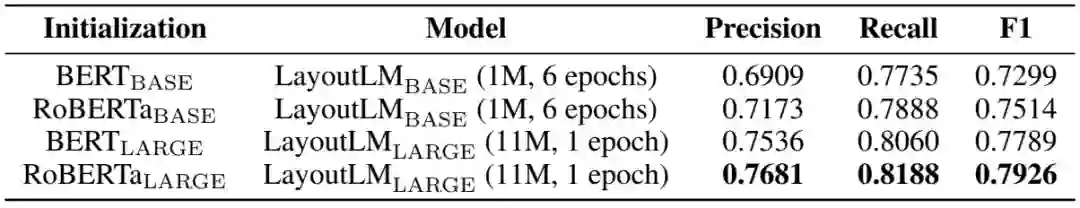 表1:LayoutLM 在 FUNSD 数据集上的实验结果