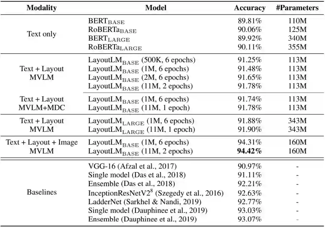 表3:LayoutLM 在 RVL-CDIP 数据集上的实验结果