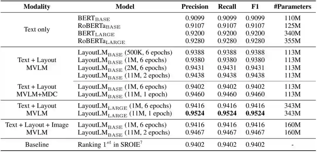 表2:LayoutLM 在 SROIE 测评上的实验结果