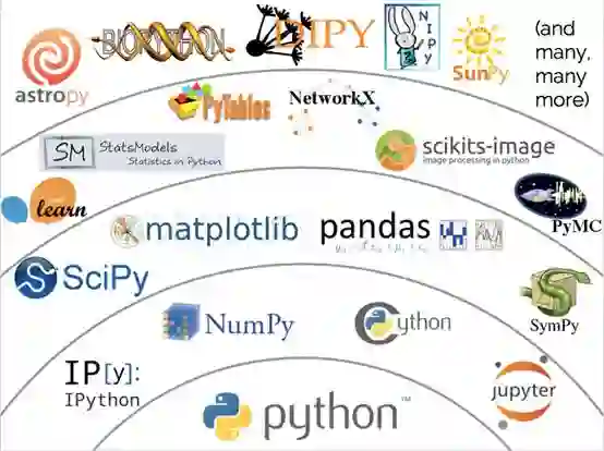 科学计算即数值计算,是指应用计算机处理科学研究和工程技术中所遇到的数学计算问题。比如图像处理、机器学习、深度学习等很多领域都会用到科学计算。有很多语言和库都提供了科学计算工具。这其中,Numpy以其简洁易用的语法和强大的性能成为佼佼者,并以此为基础形成了庞大的技术栈(下图所示)。