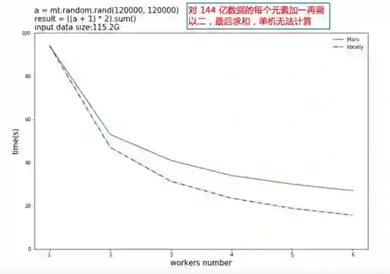 下图是进一步扩大计算规模,把数据扩大到144亿元素,对这些元素加一乘以二以后再求和。这时候输入数据就有 115G,单机的 Numpy 已经无法完成运算,Mars 依然可以完成运算,且随着机器的增多可以获得还不错的加速比。