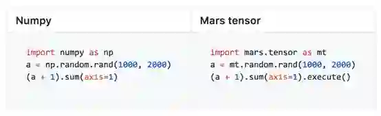 Mars 通过 tensor 模块提供兼容 Numpy 的接口,用户可以将已有的基于 Numpy 编写的代码,只需替换 import,就可将代码逻辑移植到 Mars,并直接获得比原来大数万倍规模,同时处理能力提高数十倍的能力。目前,Mars 实现了大约 70% 的常见Numpy 接口。