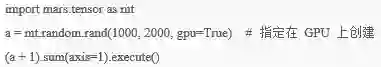 除此之外,Mars 还扩展了 Numpy,充分利用了GPU在科学计算领域的已有成果。创建张量时,通过指定 gpu=True 就可以让后续计算在GPU上执行。比如:
