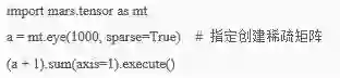 Mars 还支持二维稀疏矩阵,创建稀疏矩阵的时候,通过指定 sparse=True 即可。以eye 接口为例,它创建了一个单位对角矩阵,这个矩阵只有对角线上有值,其他位置上都是 0,所以,我们可以用稀疏的方式存储。