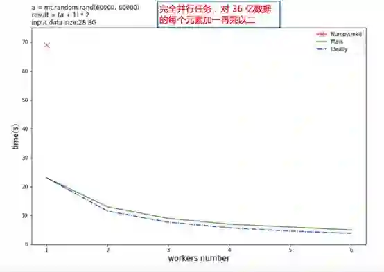 让我们再看两个对比。下图是对36亿数据矩阵的每个元素加一再乘以二,红色的叉表示 Numpy 的计算时间,绿色的实线是 Mars 的计算时间,蓝色虚线是理论计算时间。可以看到单机 Mars 就比 Numpy 快数倍,随着 Worker 的增加,可以获得几乎线性的加速比。