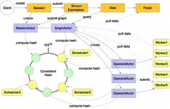 Mars 分布式执行时会启动多个 scheduler 和多个 worker,图中是3个 scheduler 和5个worker,这些 scheduler 组成一致性哈希环。用户在客户端显式或隐式创建一个 session,会根据一致性哈希在其中一个 scheduler 上分配 SessionActor,然后用户通过 execute 提交了一个张量的计算,会创建 GraphActor 来管理这个张量的执行,这个张量会在 GraphActor 中被 tile 成 chunk 级别的图。这里假设有3个 chunk,那么会在scheduler 上创建3个 OperandActor 分别对应。这些 OperandActor 会根据自己的依赖是否完成、以及集群资源是否足够来提交到各个worker 上执行。在所有 OperandActor 都完成后会通知 GraphActor 任务完成,然后客户端就可以拉取数据来展示或者绘图。