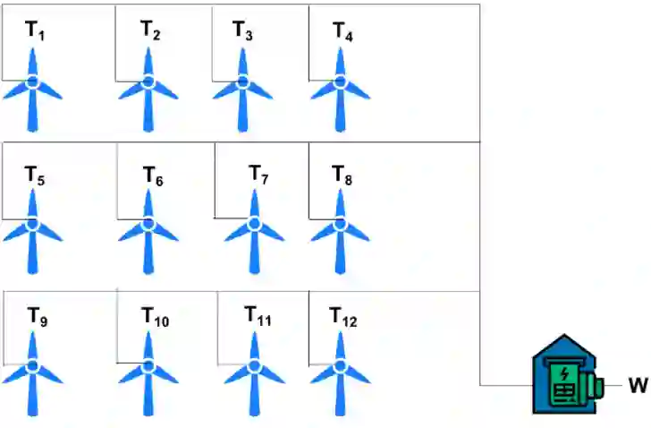 空间动态风能预测挑战,以促进数据驱动的风能预测机器学习方法的进步。具体来说,该比赛采用WPF 数据集:SDWPF,其中包括风力涡轮机的空间分布,以及时间、天气和涡轮机内部状态等动态上下文因素。然而,大多数现有的数据集和竞赛将 WPF 视为时间序列预测问题,而不知道风力涡轮机的位置和上下文信息。SDWPF 数据集的图示如下所示。每台风力发电机可以单独产生风力Ti,风电场的输出功率是所有风力发电机的总和。换句话说,在时间 t,风电场的输出功率为W=∑_i T_i 。