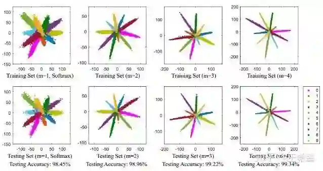 由于L-softmax有一个更加难的实现目标,所以说它更能避免过拟合。同时L-softmax不仅在分类问题上有优势,同样在识别问题上也有优势,因为它使得类内的距离更加的紧凑。 通过控制m的大小,调整类间距离。m越大,类间距离就越大,类内更加紧凑。