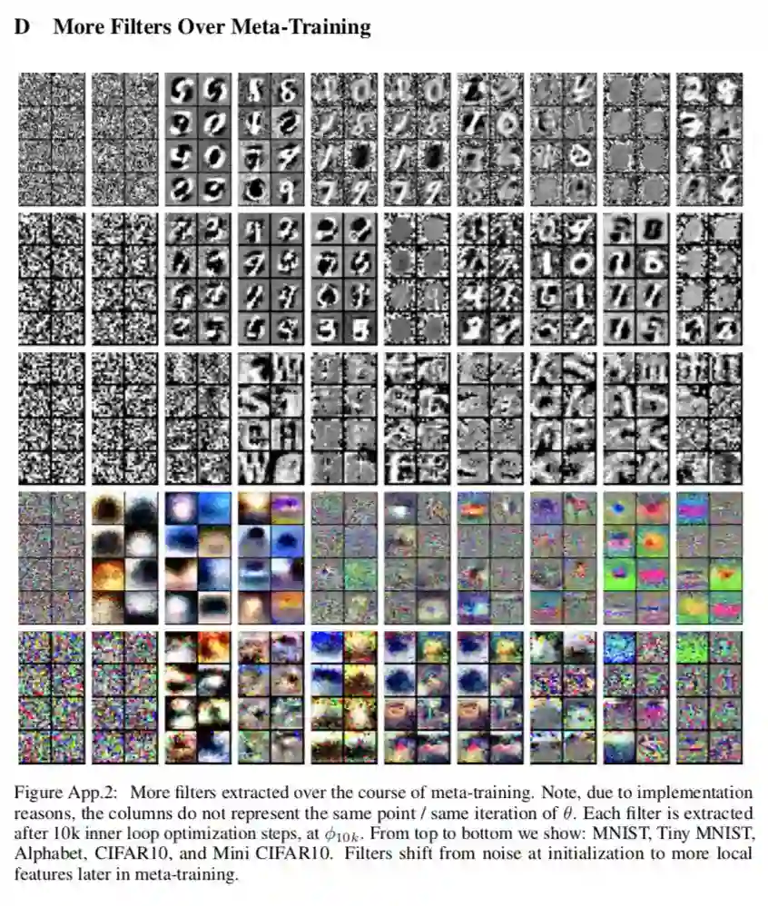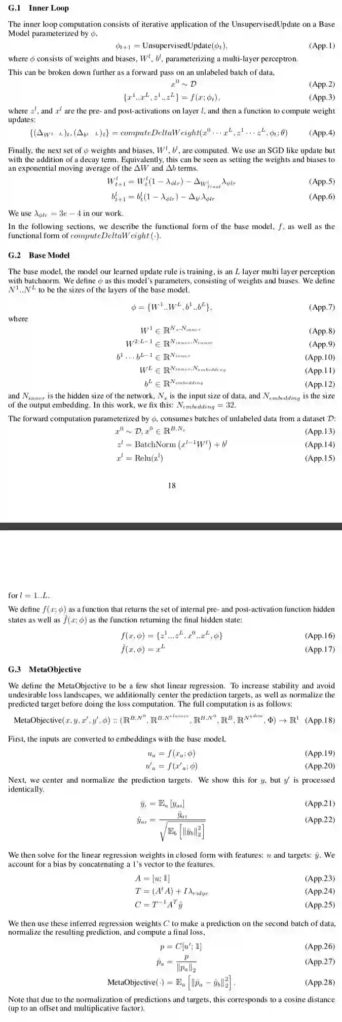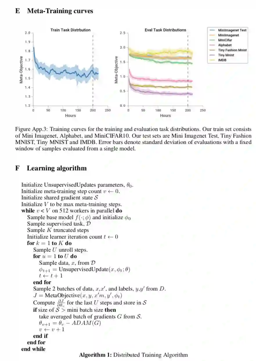 We implement the above models in distributed Tensorflow [55]. Training uses 512 workers, each of which performs a sequence of partial unrolls of the inner loop UnsupervisedUpdate, and computes gradients of the meta-objective asynchronously. Training takes ∼8 days, and consists of ∼200 thousand updates to θ with minibatch size 256. Additional details can be found in Appendix C.