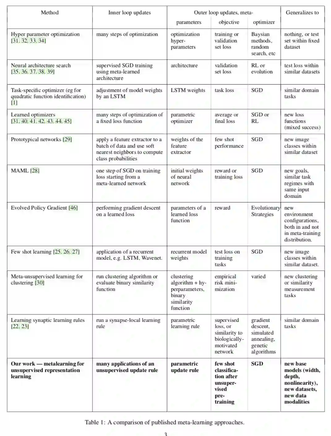 In contrast to our work, each method imposes a manually defined training algorithm or loss function to optimize whereas we learn the algorithm that creates useful representations as determined by a meta-objective.