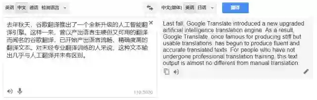 去年秋天,谷歌翻译推出了一个全新升级的人工智能翻译引擎。这样一来,曾以产出语言生硬但又可用的翻译而闻名的谷歌翻译,已开始产出语言流畅、精确度高的翻译文本。对未经专业翻译训练的人来说,这种文本输出几乎与人工翻译并未有区别。以当前这段话为例,翻译结果如图一所示。