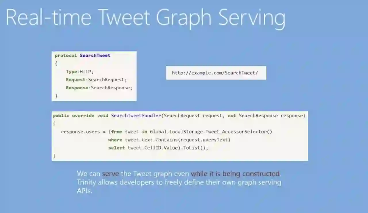 我们可以用这个做什么事情呢?当一条推文来了之后,我们可以把它放到Graph Engine里。在消息处理器中找到这条推文应该存的地方,比如,哪个用户发的,提到了哪些人等等。在做这件事情的同时,实体间的关系就建立起来了,因为一个用户发了一个推文,会有一个关系连到一条边,如果推文里提到了其他人,那么系统就不仅是存下了这条信息,还可以把所有关系都实时建立起来。